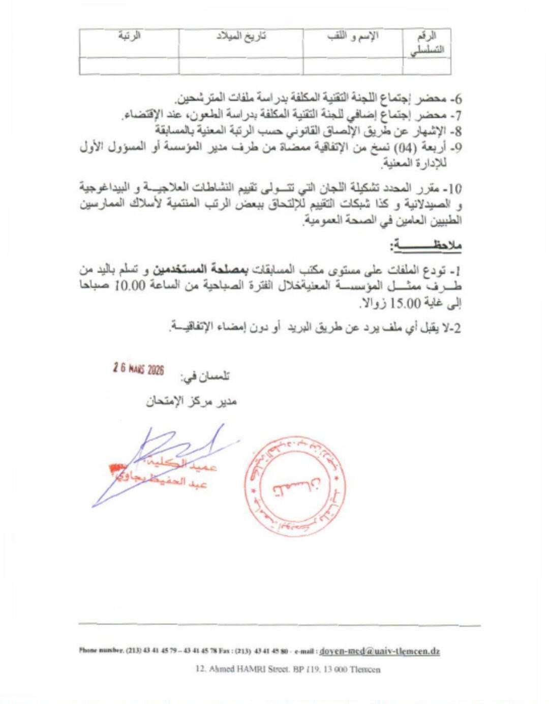 La Faculté de Médecine Dr Benzerdjeb Benouda de l’Université Abou Bekr Belkaïd de Tlemcen informe les établissements et administrations publiques concernés de l’organisation de concours sur épreuves et examens professionnels au titre de l’année 2026, pour le recrutement et l’accès aux grades suivants : médecin généraliste de santé publique, médecin généraliste principal de santé publique, chirurgien-dentiste généraliste de santé publique, chirurgien-dentiste généraliste principal de santé publique, ainsi que chirurgien-dentiste principal de santé publique. La date de déroulement des épreuves est fixée au samedi 13 juin 2026 à 10h00. Les dossiers de candidature doivent être déposés auprès du centre concerné au plus tard le jeudi 04 juin 2026. Les dossiers incomplets, transmis par voie postale ou non conformes aux conditions exigées, ne seront pas acceptés.