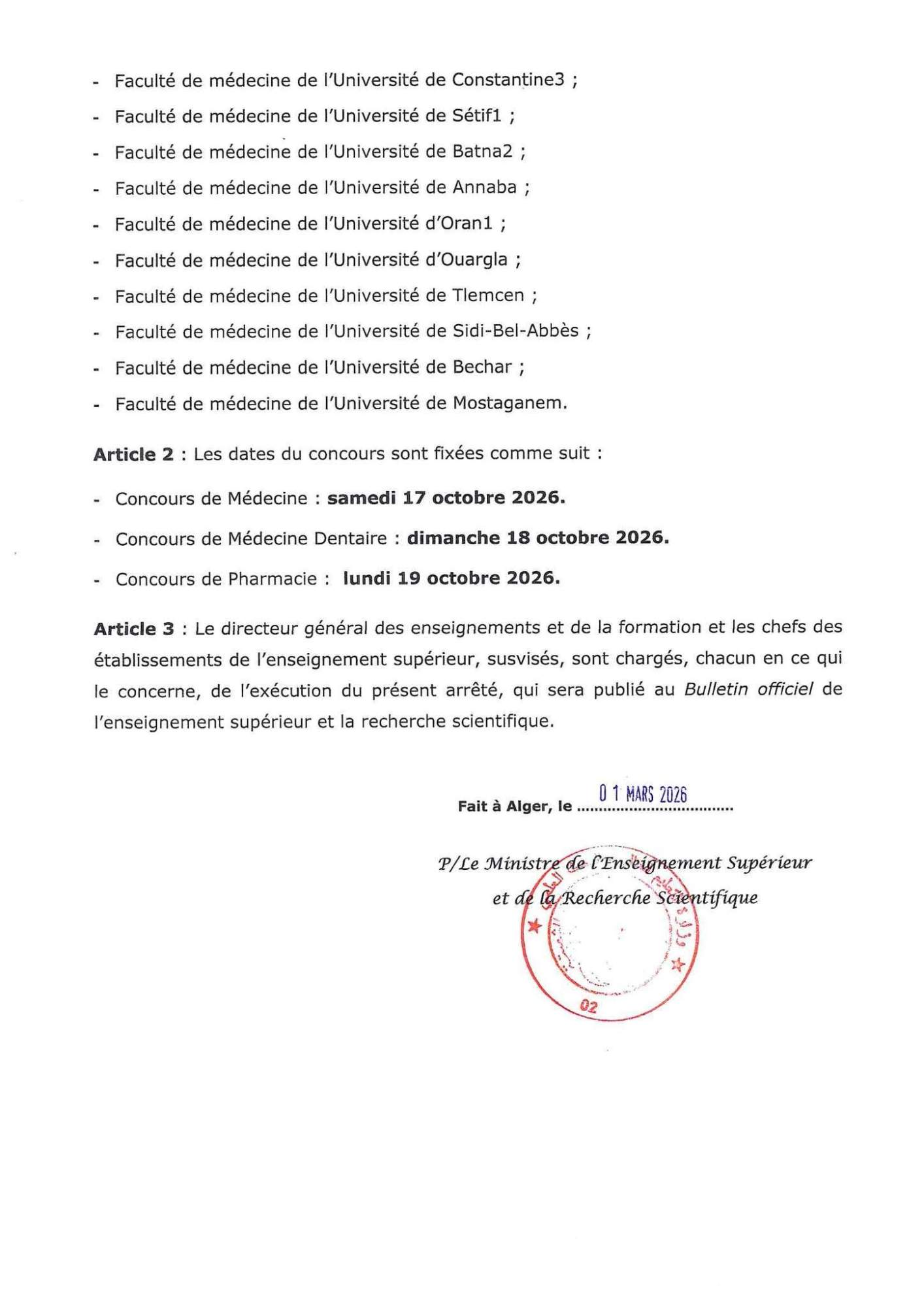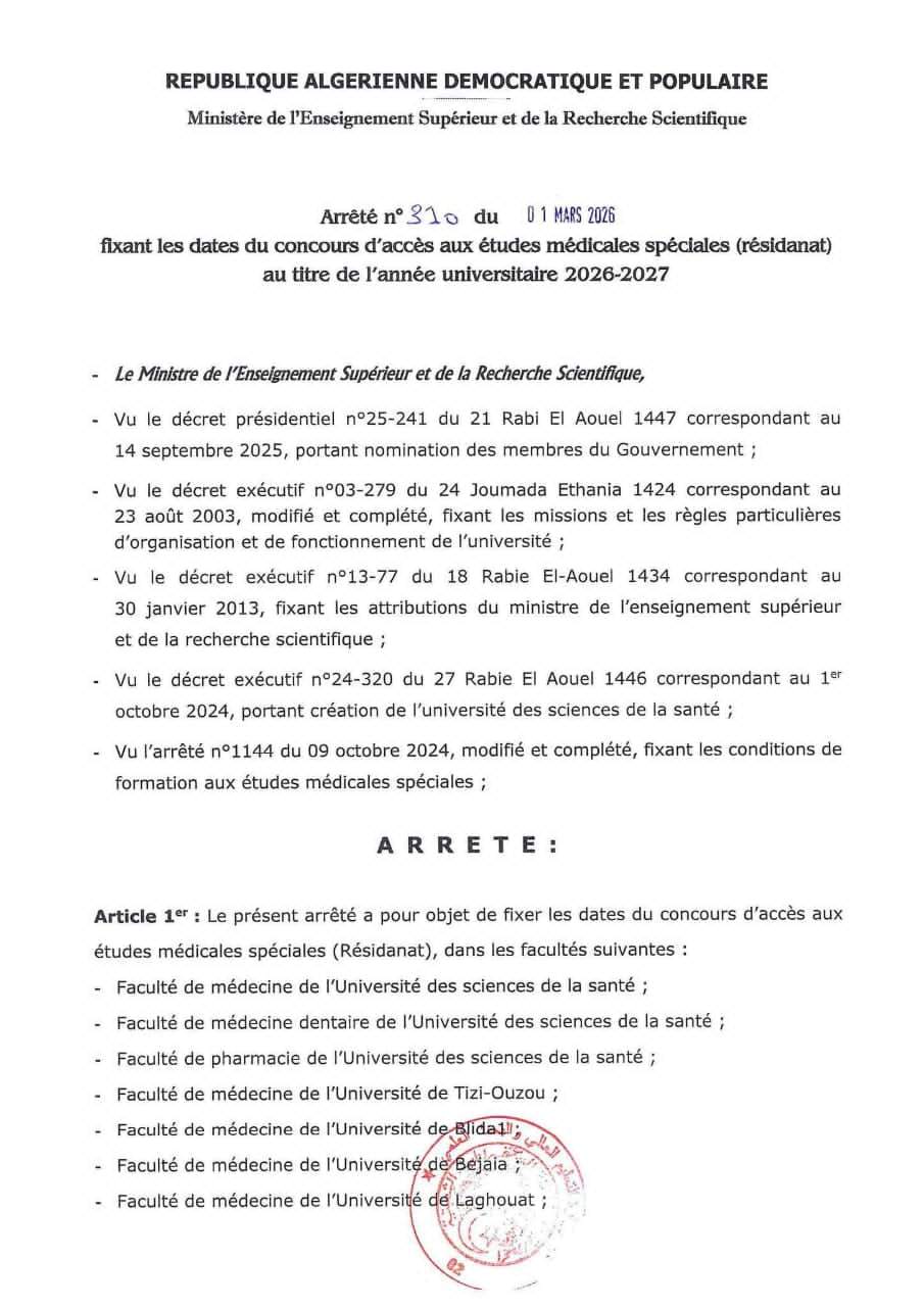 Dates des concours d accès aux études médicales spécialisées RESIDANAT 2026 - 2027