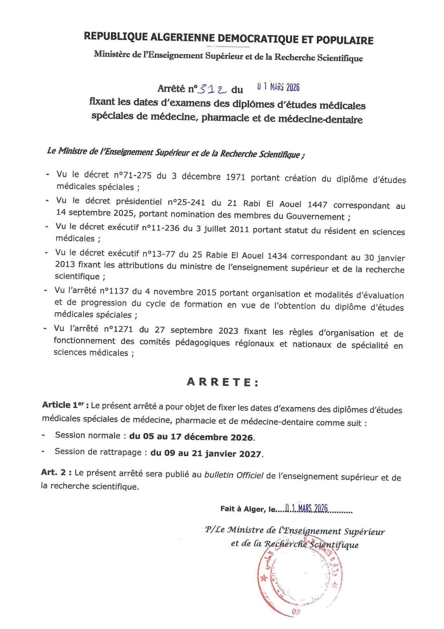 Dates des concours d accès aux études médicales spécialisées RESIDANAT 2026 - 2027