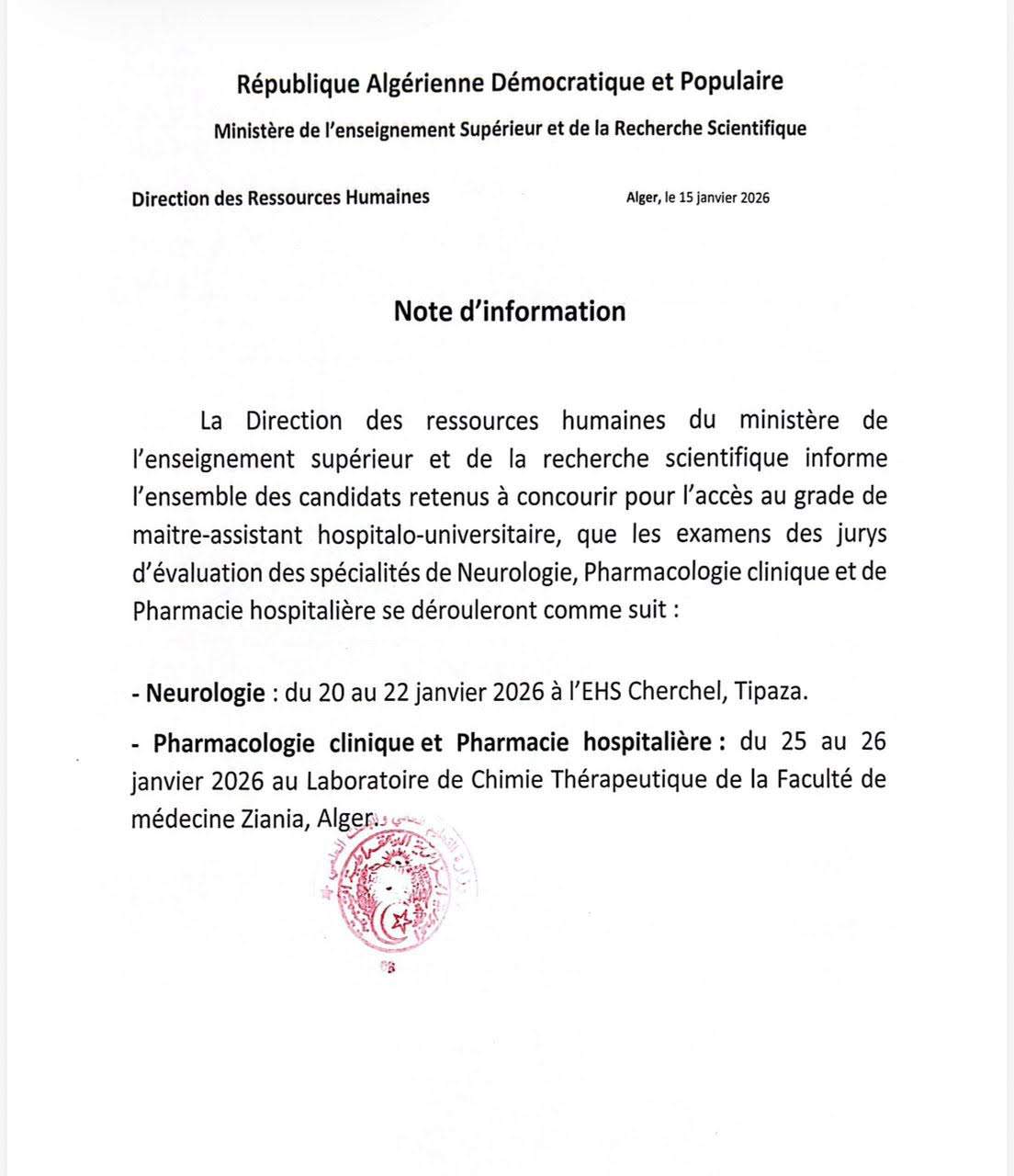 La Faculté de Médecine de l’Université de Tlemcen informe les candidats que le planning des dates des examens d’accès au grade de Maître Assistant Hospitalo-Universitaire est mis à leur disposition. Les intéressés sont invités à consulter le calendrier détaillé joint en pièce jointe afin de prendre connaissance des dates prévues. Toute information complémentaire sera communiquée ultérieurement par les voies officielles de la faculté.